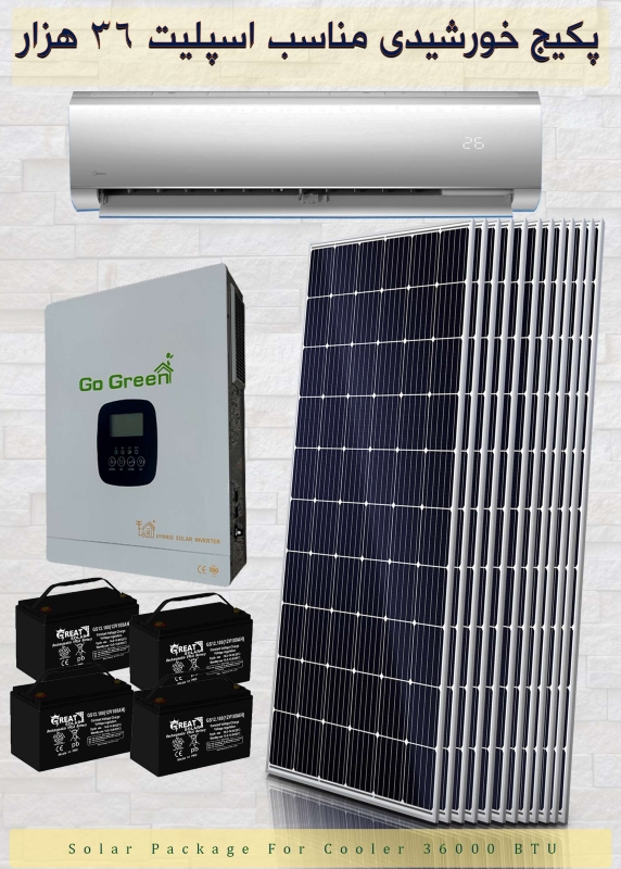 این پکیج بهطور اختصاصی برای تأمین انرژی کولر گازی 36000 BTU در طول روز طراحی شده است. باتریهای موجود در سیستم امکان ذخیره انرژی برای استفاده در شرایط ابری یا شبهنگام را فراهم میکنند. با این پکیج میتوانید: